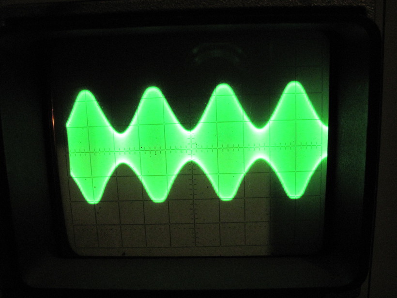 Поскольку прибор Райфа воспроизвести нет возможности, я решил использовать в качестве излучателя катушки Мишина, модулируя частоту на которой работают эти катушки (примерно 300 кГц) частотами из таблиц Райфа. Большинство частот Райфа лежит в звуковом диапазоне и доступны для воспроизведения MP3 плеерами, мобильными телефонами, смартфонами, планшетами, ноутбуками, компьютерами. На осциллограмме ниже - пример такой модуляции.