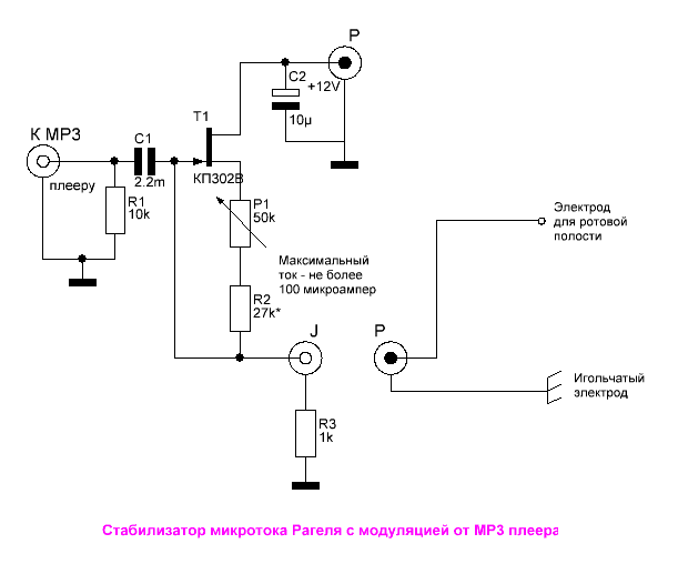 Возникла идея использовать в качестве носителя исцеляющей информации микротоки прибора Рагеля. На днях удалось воплотить эту идею в "железо". Вот схема простейшего стабилизатора микротока с возможностью модуляции его звуковыми файлами: