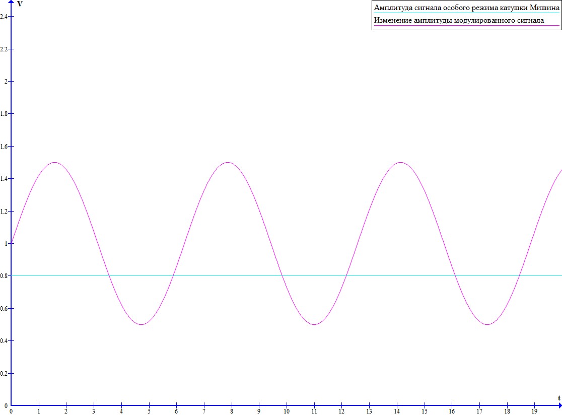 - если установить величину выходного сигнала близкой к 1 вольту, то при подаче модулирующего сигнала, к примеру, размахом 0,5 вольта, амплитуда выходного сигнала будет меняться от 0,5 вольта до 1,5 вольта. А это значит, что он многократно будет пересекать точку особого лечебного режима катушки (порядка 0,8-0,9 вольт), о которой говорил Мишин. То есть катушка дважды за период модулирующей частоты будет излучать в особом целебном режиме.
