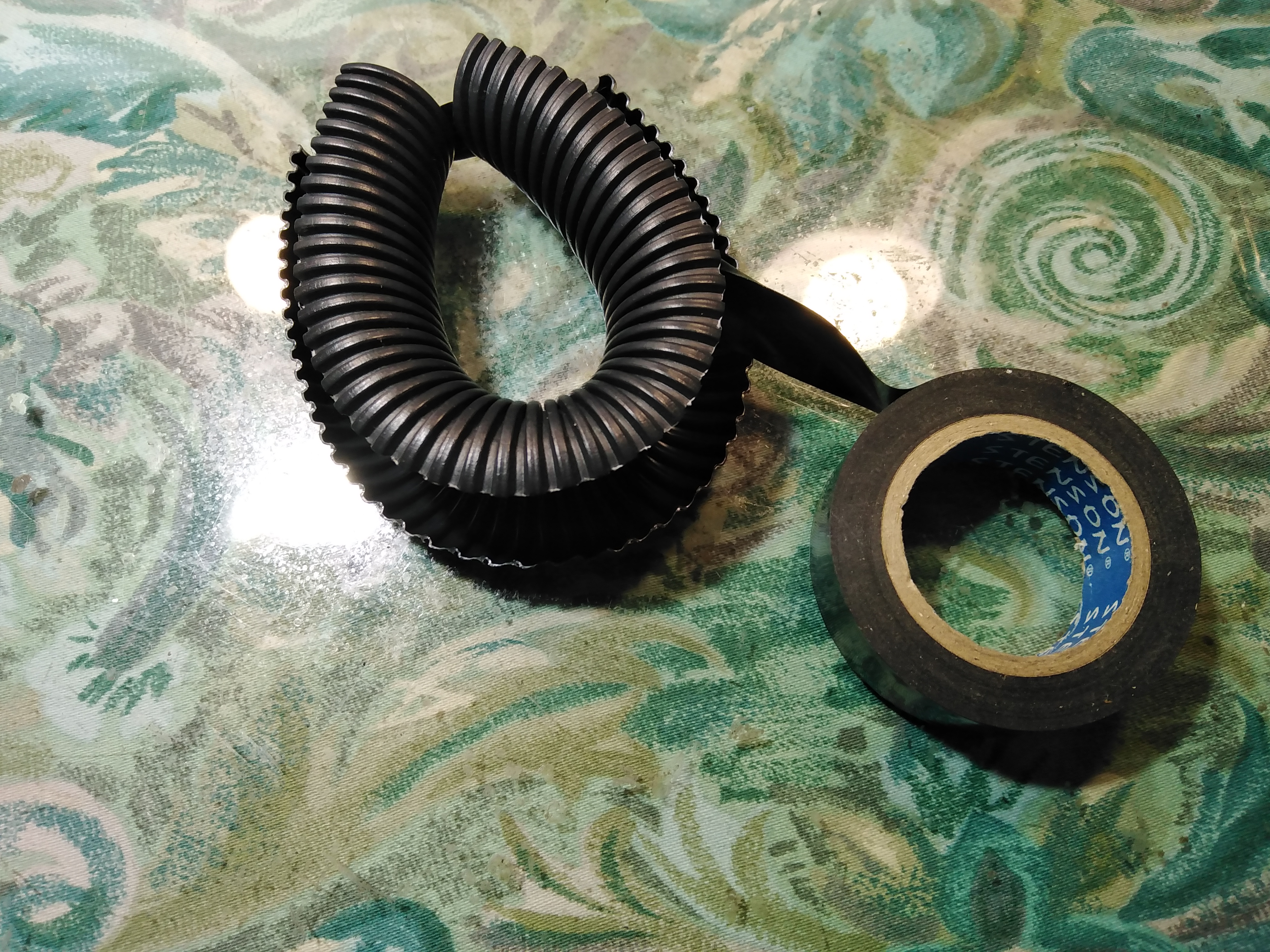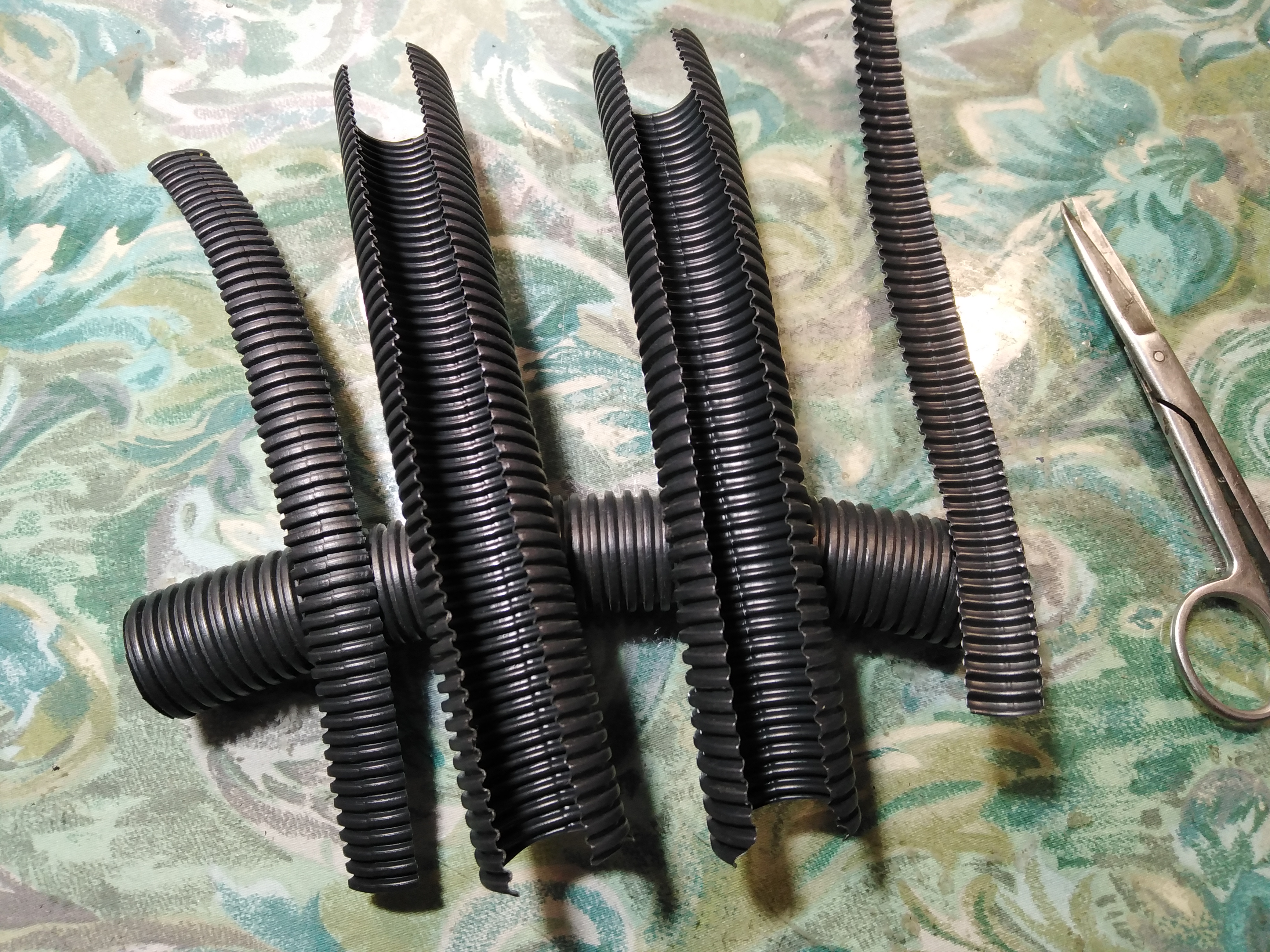 Обычно гофра немного изогнута и по большему, внешнему её радиусу ножницами делаю прорези для намотки провода.