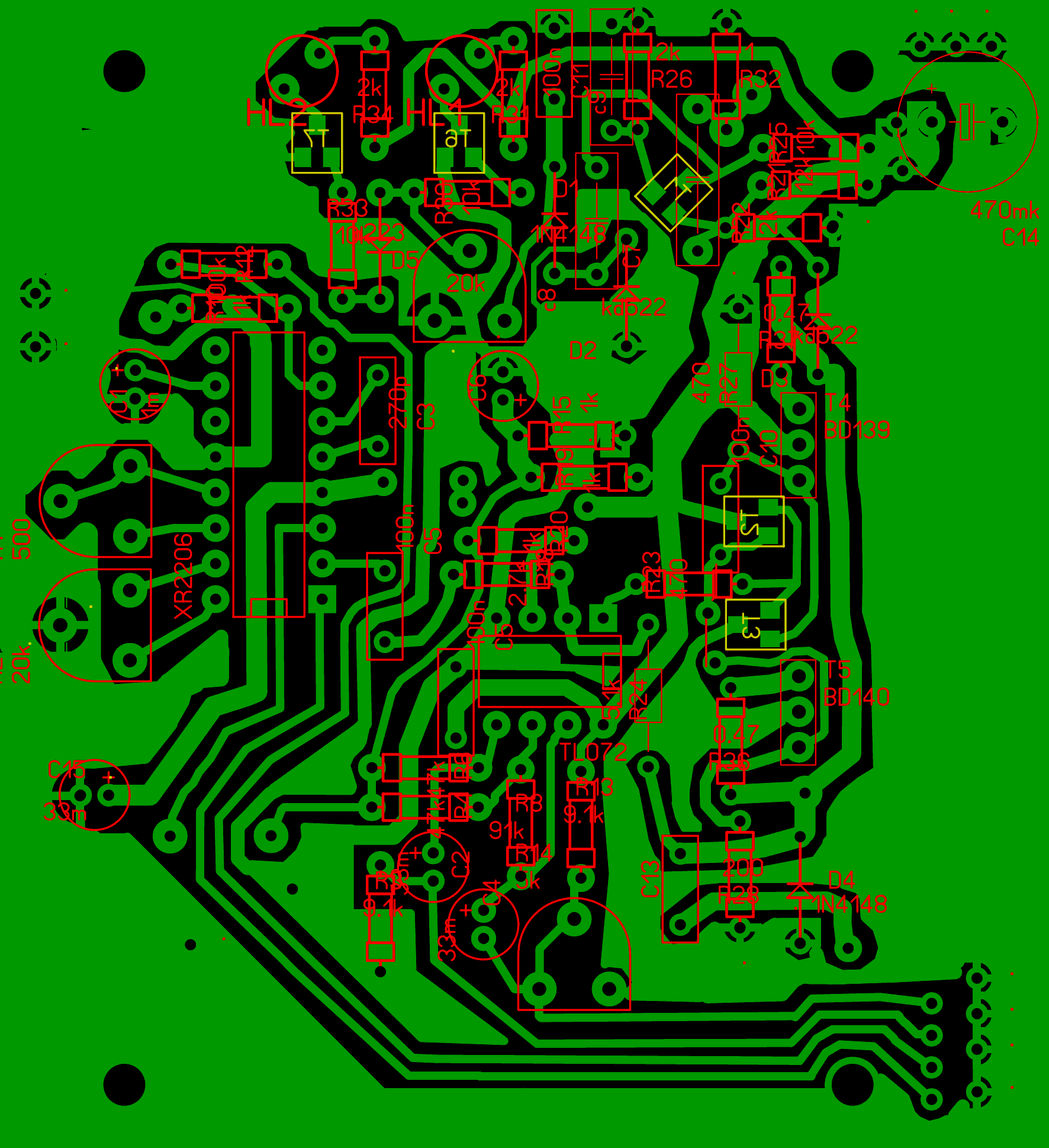 Основное отличие от предыдущей версии - применение одной микросхемы TL072 вместо двух TL071, добавление локальной обратной связи для выходных транзисторов, а также уточнение некоторых номиналов элементов схемы. Ну и конечно, оптимизация печатной платы.